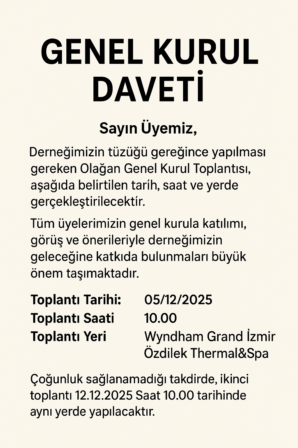 Tüm üyelerimizin genel kurula katılımı, görüş ve önerileriyle derneğimizin geleceğine katkıda bulunmaları büyük önem taşımaktadır.
